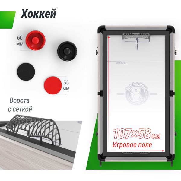 Вы можете менять 4 поля и играть в разные игры. Стол трансформер предлагает вам насладиться игрой в хоккей. Ощутите адреналин и динамичность этих игр, пытаясь забить шайбу в ворота противника. Быстрые движения, точность и реакция - все это станет вашими лучшими помощниками в достижении победы. В комплекте идут 2 биты и 2 шайбы, а также 2 клюшки и 2 шайбы для игры в хоккей.