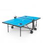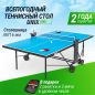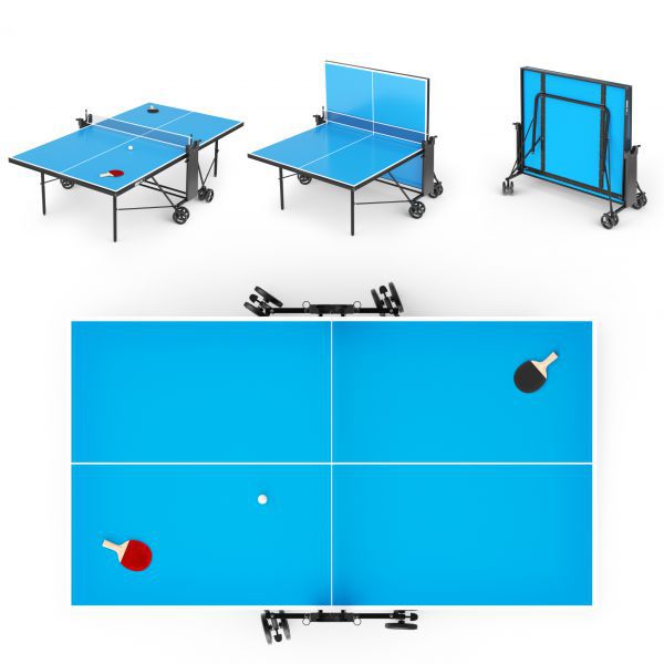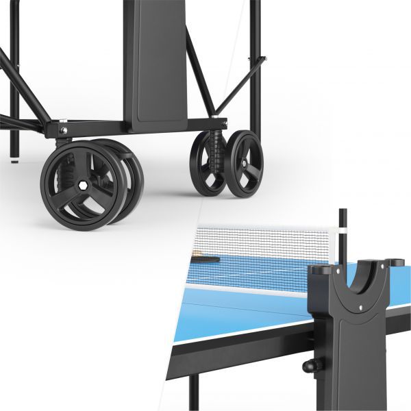 Стол построен на стальном каркасе 30x30 мм с толщиной 1,2 мм с антикоррозионным покрытием, что обеспечивает его жесткость и устойчивость на различных поверхностях. Опоры теннисного стола оборудованы компенсаторами неровности пола. Отличительной особенностью компактного стола для дома и улицы является возможность поднять одну сторону столешницы, позволяя играть в одиночку, что идеально подходит для оттачивания тренировки техники удара и улучшения навыков без необходимости искать партнера. Стол занимает меньше места, когда используется в режиме одиночной игры, делая его отличным выбором для небольших помещений. Предусмотрены отделения для хранения до 4-х мячей с каждой стороны.