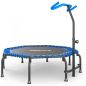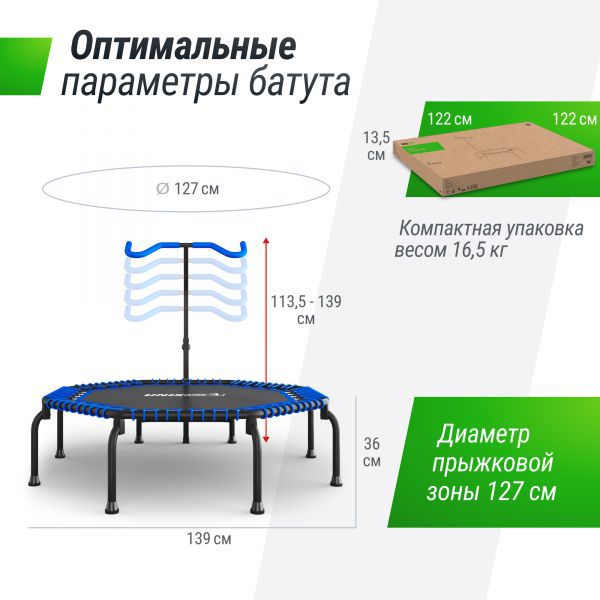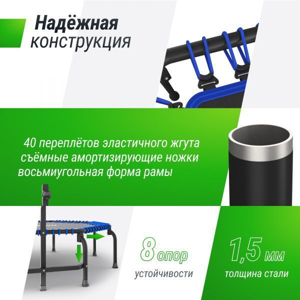 Фитнес батут с ручкой сочетает в себе высокое качество, прочность и безопасность, чтобы вы могли наслаждаться тренировкой в полной мере. Мощная восьмиугольная рама с толщиной стали 1.5 мм, и дополнительная горизонтальная поперечина придает жесткость конструкции и позволяет выдерживать самые продолжительные и интенсивные тренировки. Специально разработанная пружинная система обеспечивает мягкое отскоковое движение, снижая нагрузку на суставы и предотвращая возможные травмы. Прыжковое полотно из материала Permatron соединяется с рамой с помощью 40 (сорок!) переплетов жгута. Максимальный вес пользователя до 150 кг.
