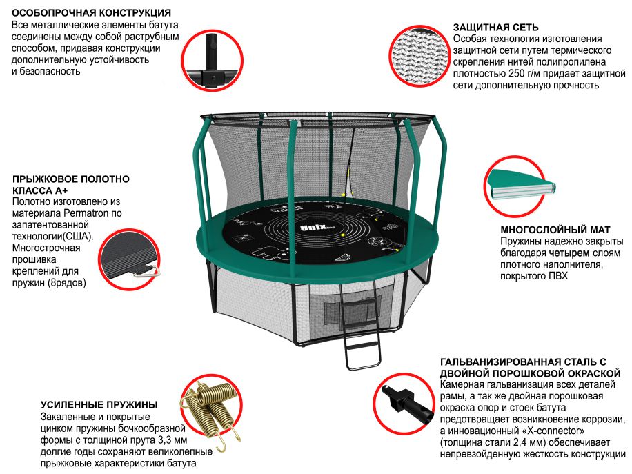 Металлический каркас выполнен из особо прочной гальванизированной стали с использованием новейшей системы креплений деталей рамы «X-Conneсtor» (толщина стали 2.4 мм), что обеспечивает высокую надежность рамы и уровень безопасности пользователя. Прыжковое полотно обладает повышенной износостойкостью благодаря высокой плотности волокон полипропилена. Защитный мат для пружин, расположенный по периметру, состоит из четырех слоев, обшитых ПВХ материалом, плотностью 150 г/см3 и надежно закрывает пружины.