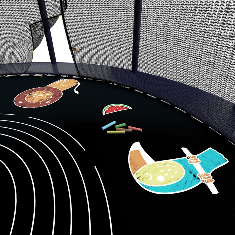 Защитный мат для пружин, расположенный по периметру батута, состоит из четырех слоев, обшитых ПВХ материалом, плотностью 150 г/см3 и надежно закрывает пружины.