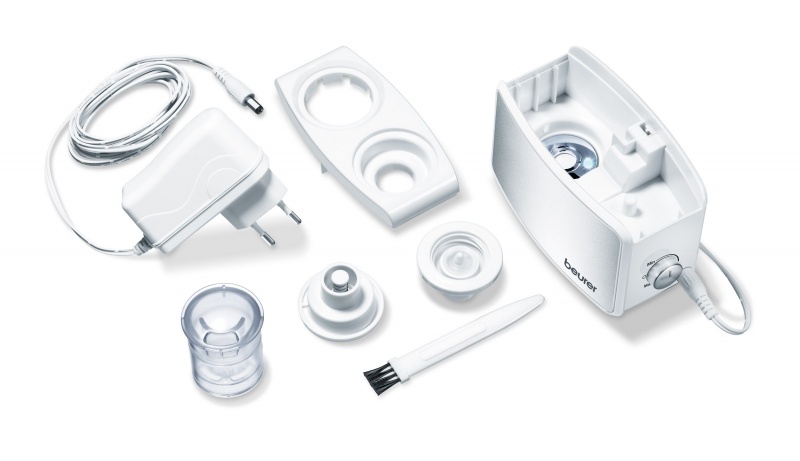 Допускается чистка прибора в посудомоечной машине. Интенсивность распыления можно регулировать при помощи плавного ролика. В набор входит специальная очищающая щеточка и футляр для хранения и транспортировки увлажнителя.