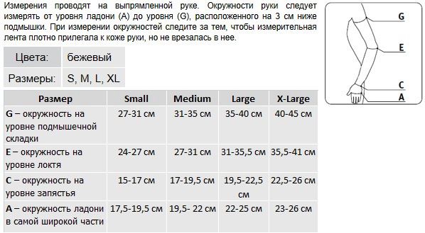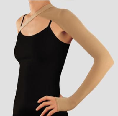 Противоотечные компрессионные рукава (26–32 мм рт. ст.) применяют при первичной лимфедеме (врожденные аномалии лимфатической системы), а также при вторичной лимфедеме, возникшей в результате мастэктомии, при длительном ограничении подвижности руки, при повреждении лимфатических сосудов вследствие травм, операций, глубоких ожогов, при тромбофлебитах вен плеча и предплечья.