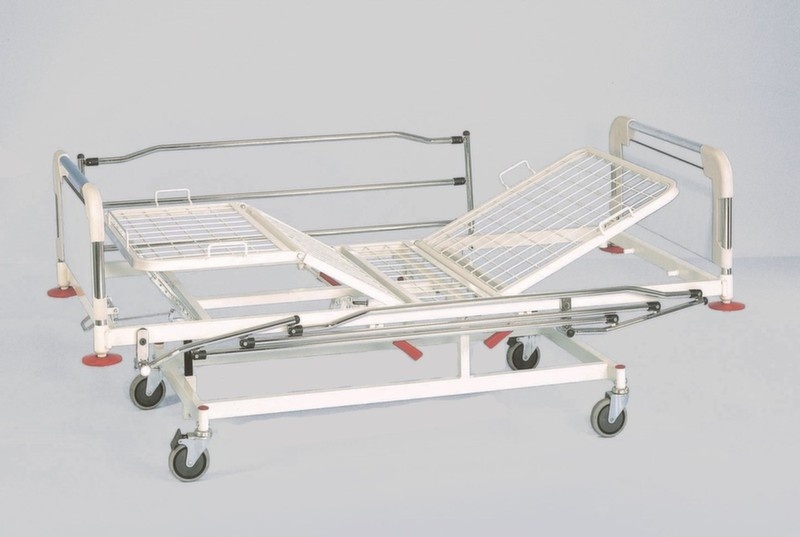 Подвижные секции кровати контролируются механическим приводом. Металлический каркас и ложементы пригодны для санитарной обработки соответствующими средствами. Углы торцевых спинок оборудованы пластиковыми бамперами. Колеса снабжены тормозными фиксаторами.