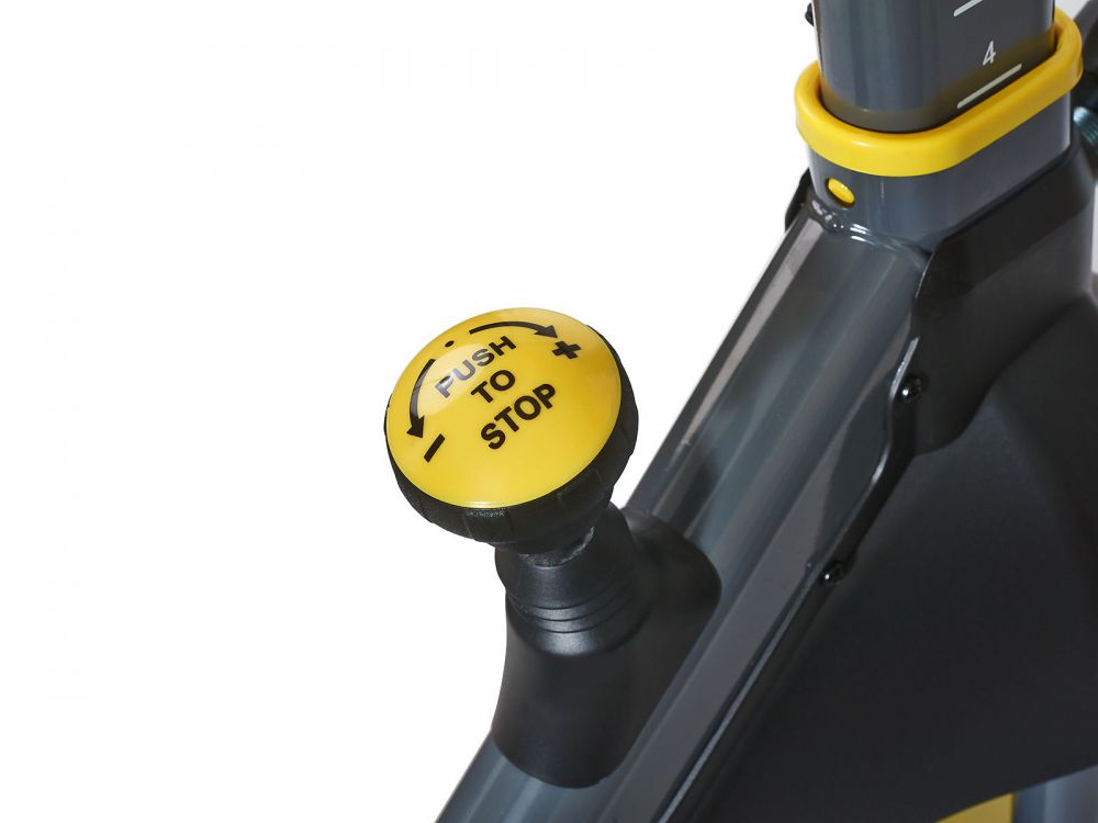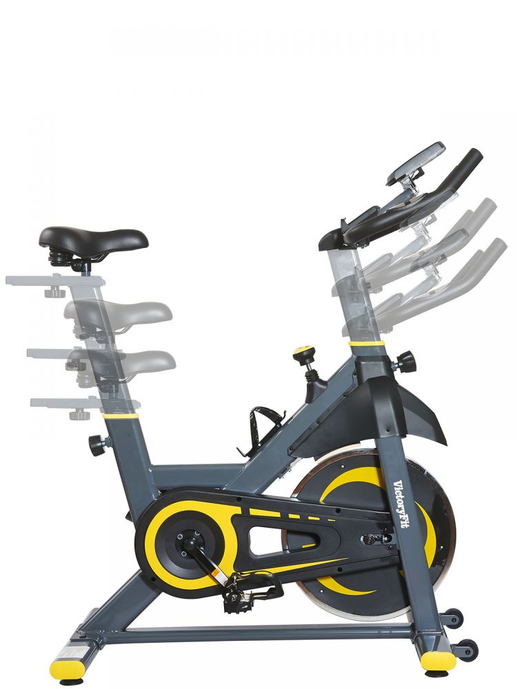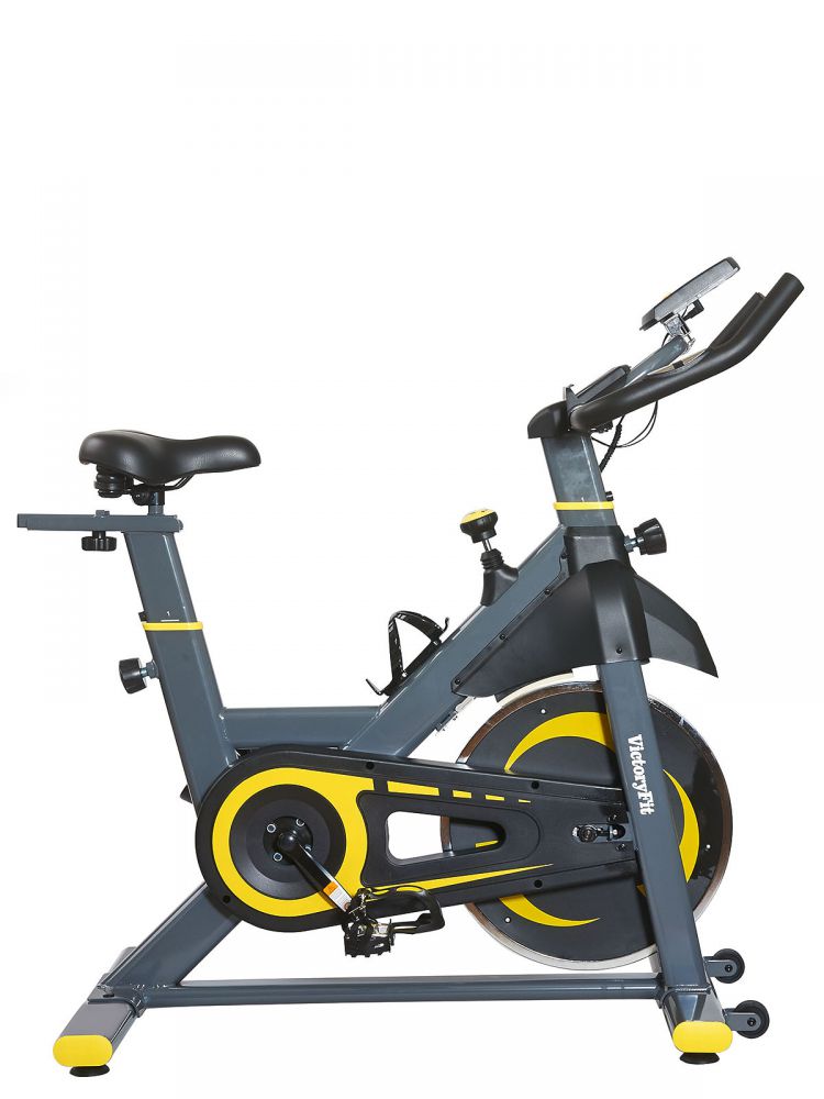 Cпинбайк VictoryFit VF-S200 — тренажер является эффективным помощником при борьбе с лишним весом, а также способствующим укреплению кардиосистемы. Инерционная система нагрузки включает в себя маховик весом 6 кг, предусмотрено изменение уровней нагрузки за счет колодки, прижимающейся к маховику. Наряду с регулировкой рулевого блока, настраивается высота и глубина посадки сиденья. В зависимости от выбранной высоты, расстояние от седла до педалей составит от 75 до 95 см. На руле установлены пульсометры, в комплекте с тренажером поставляется компьютер, отображающий время, скорость, дистанцию, затраченные калории, общее пройденное расстояние, пульс.