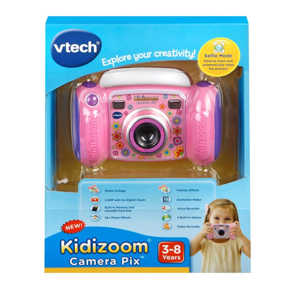Цифровой фотоаппарат Kidizoom Pix от бренда Vtech - это детская фотокамера с широким спектром возможностей. Камера обладает цветным дисплеем, двойным видоискателем, диктофоном, зумом, встроенной памятью и слотом для дополнительной карты памяти, возможностью видеосъемки. Кидизум оснащен функциями, с помощью которых можно украсить сделанные фотографии и видеоролики рамочками, штампиками и массой других интересных эффектов. В камере, также, записаны четыре игры, существует возможность установки новых игр и эффектов через специальный сервис. Вместе с камерой представлен браслет, на котором удобно ее носить, и руководство по эксплуатации.
