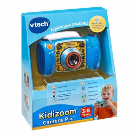Kidizoom Pix с цветным дисплеем оснащена 1,3 Мп камерой и предназначена для детей от 3 лет. Используя гаджет ребёнок сможет делать фото, снимать видео и добавлять в них спецэффекты с помощью специальных приложений. В устройство встроено 128 Мб памяти, которой хватит на то, чтоб сделать около 1000 фотографий. Есть слот для карты памяти типа microSD/SDHC. В комплект входит USB-кабель, с помощью которого в устройство можно закачивать новые игры и приложения.