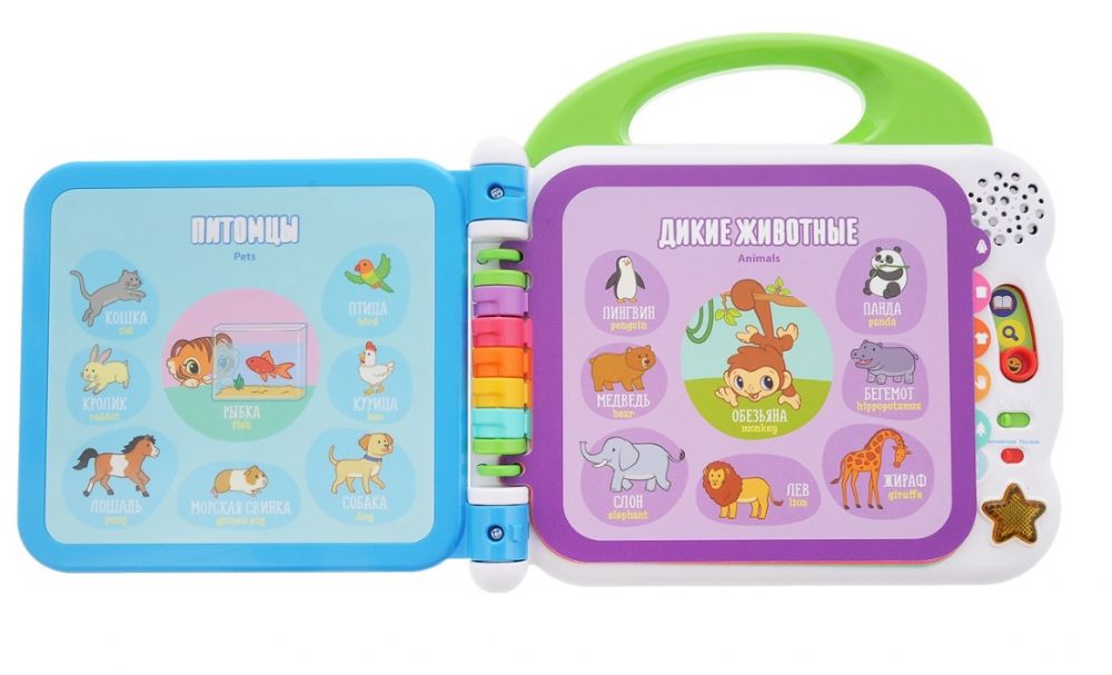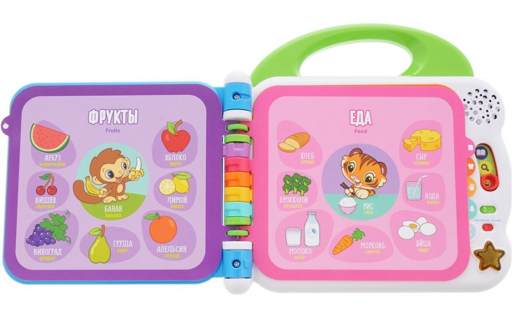 С этой игрушкой ребенок сможет самостоятельно пополнить свой словарный запас, причем не только на русском, но и на английском языке. Он выучит наиболее распространенные фразы и наименования предметов, животных, еды, частей тела и прочие слова, необходимые для повседневного общения.