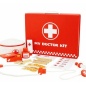 В наборе множество приспособлений доктора, такие как карточки пациента, пластыри, различные лекарства, шприц, стетоскоп и другие медицинские принадлежности.