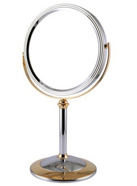 Круглая классическая форма зеркала очень удобная при использовании. Стоит также отметить привлекательный вид данного изделия, корпус которого имеет серебряный цвет с золотыми вставками. А для более удобного применения предусмотрена надежная подставка, которая обеспечивает устойчивость зеркалу.