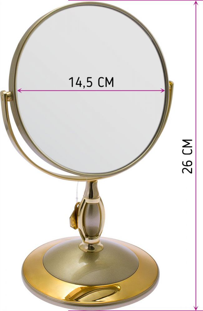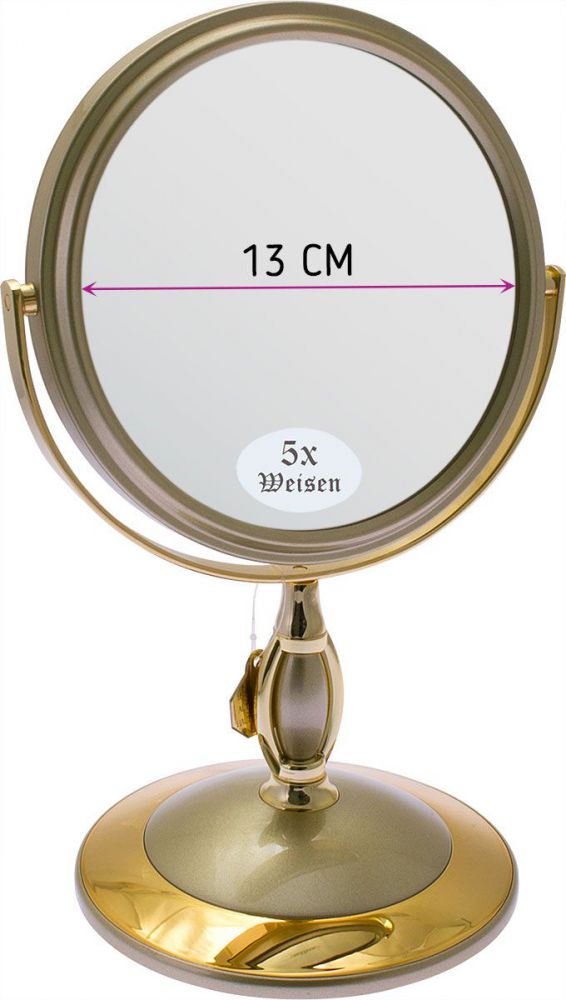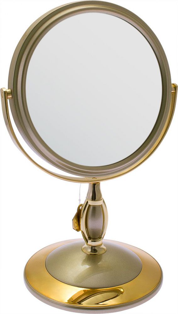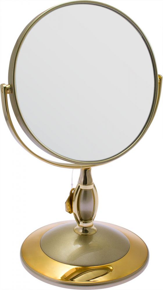 Зеркало косметическое, настольное, двустороннее Weisen B6"806 G5/G Gold. Изготовлено из хромированного металла и пластмассы покрытой цветным лаком. Тончайшее высококачественное стекло, используемое при изготовлении (1,5 мм), не даёт искривлений зеркальной поверхности. Увеличение в 5 раз. Приятный, красивый подарок для любой женщины.