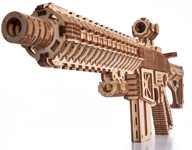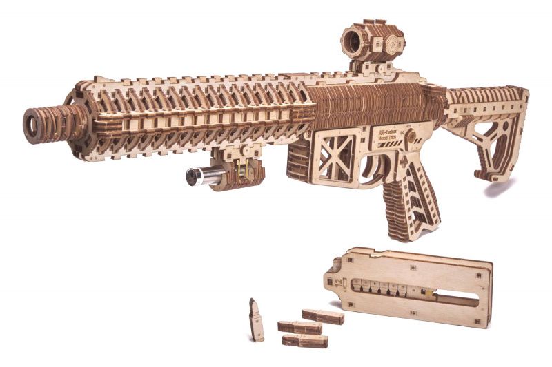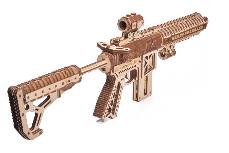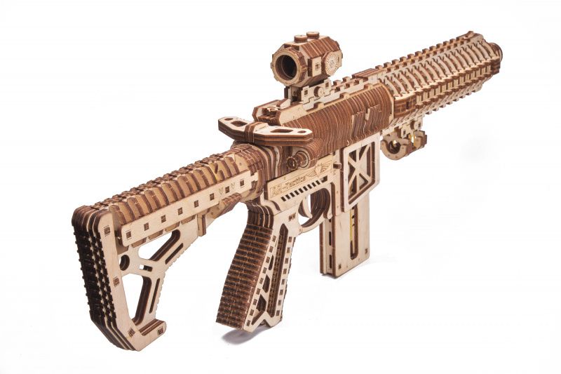 Wood Trick пополнился уникальной сувенирно-коллекционной моделью - Штурмовой винтовкой AR-T. Этот деревянный конструктор получил максимальную деталировку, а также обойму на 12 патронов. Вдохновившись автоматами серий М16 и AR15, представляем Вам смелый боевой комплект. «Штурмовая винтовка AR-T» состоит из 496 деталей.