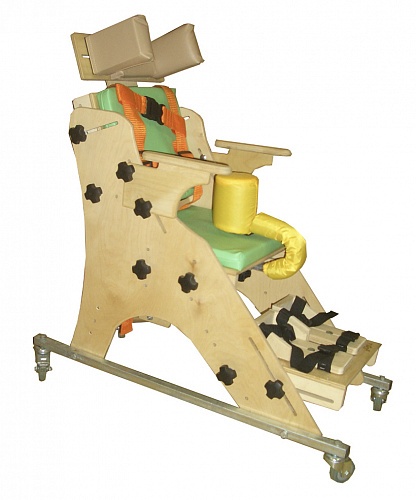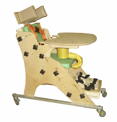 Опора для сидения ОС-001.1 предназначена для реабилитационных мероприятий с детьми с ограниченными возможностями, с патологиями различной степени тяжести, в том числе ДЦП. Представляет собой регулируемое ортопедическое кресло на металлической колесной основе. Комплектуется съемным столиком, укрепляемым на подлокотники и съемным регулируемым подголовником. Возрастные ограничения: для детей дошкольного и младшего школьного возраста. Рама опоры изготовлена из высококачественной фанеры со стойким противоаллергенным покрытием, расположена на металлической колесной основе.Колеса поворотные, задние колеса оснащены тормозами. Наполнение мягких элементов опоры изготовлено из высококачественного поролона, покрытие – экологически чистая винилис кожа, стойкая к обработке традиционными моющими средствами.