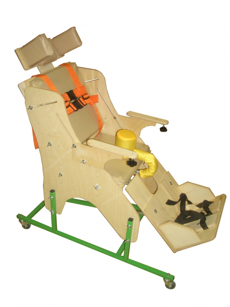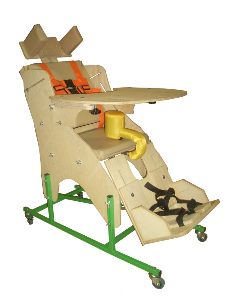 Опора для сидения ОС-001.2 предназначена для реабилитационных мероприятий с детьми с ограниченными возможностями, с патологиями различной степени тяжести, в том числе ДЦП. Представляет собой регулируемое ортопедическое кресло на металлической колесной основе. Комплектуется съемным столиком, укрепляемым на подлокотники и съемным регулируемым подголовником.