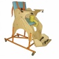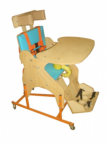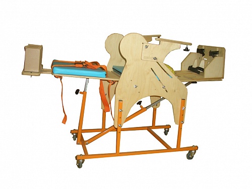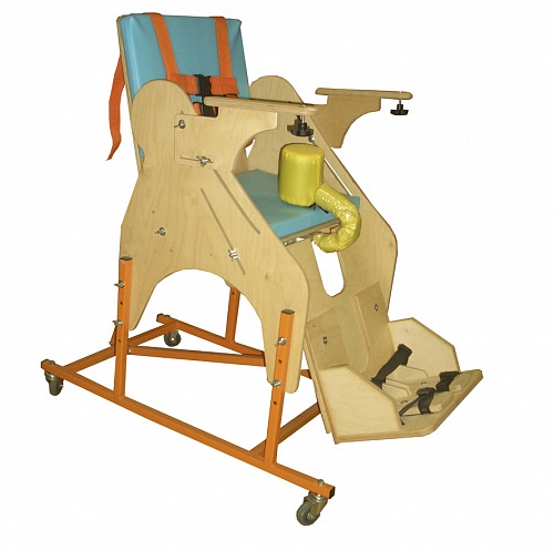 Опора для сидения предназначена для реабилитационных мероприятий с детьми с ограниченными возможностями, с патологиями различной степени тяжести, в том числе ДЦП. Опора ОC-003.1. – техническое средство реабилитации для детей-инвалидов, используемое как опора для лежания (на спине) и опора для сидения, а так же для поэтапного перевода ребенка из положения лежа в положение сидя. Состоит из металлической основы на ножках (по выбору может располагаться на колесах с тормозами - дополнительное оборудование), деревянных боковин с регулируемыми подлокотниками, кресла с регулируемыми спинкой и сидением, регулируемой подножки с креплениями для стоп, системы ремней для крепления тела. Дополнительно могут поставляться регулируемый подголовник, регулируемый столик, комплекты подушек для регулирования ширины сидения и спинки. Боковины опоры изготовлены из высококачественной фанеры со стойким противоаллергенным покрытием, расположены на металлической основе с порошковым покрытием. Наполнение мягких элементов опоры изготовлено из высококачественного поролона, покрытие – экологически чистая винилис кожа, стойкая к обработке традиционными моющими средствами.