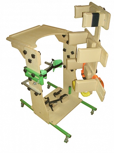 Опора для стояния – вертикальная стойка-вертикализатор, предназначенная для пассивных реабилитационных мероприятий, направленных на адаптацию пациента к вертикальному положению, формирование чувства равновесия, адаптацию кровеносной системы и внутренних органов к новым нагрузкам в условиях вертикального положения тела. Применяется при ДЦП и других патологических состояниях, когда ребенок-инвалид не имеет возможности стоять самостоятельно. Комплектуется столиком для приема пищи и занятий. Выпускается в 2 размерах. Деревянная рама, на металлической колесной основе с 4 колесами с тормозами, обеспечивающими возможность перемещения ребенка в вертикализаторе внутри помещения. Крепления для стоп типа «сандалии», с жестким пяточным упором, с независимой регулировкой положения стоп ( влево-вправо и вперед-назад), регулировкой расстояния между стопами. Коленные крепления, независимо регулируемые в 3 плоскостях. Инновационная система крепления тела позволяет надежно закрепить ребенка в вертикализаторе. Бедренная и грудная обоймы, регулируемые по высоте, с боковыми упорами, регулируемыми по ширине.