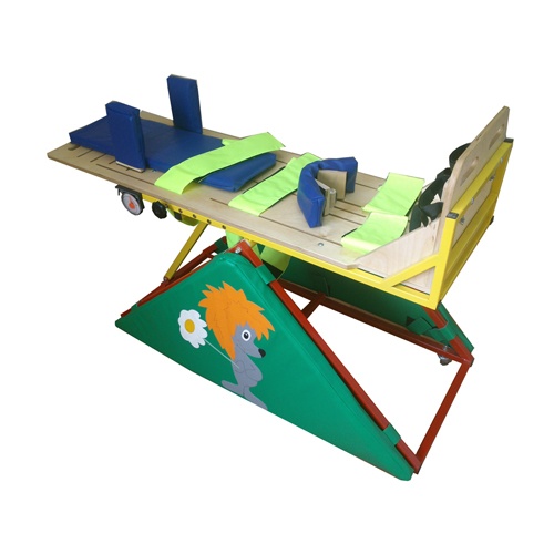Механизм обеспечения наклона ложа реализован за счет телескопической направляющей, расположенной сзади ложа. Закрепление выбранного угла наклона производится двумя фиксаторами. Опора комплектуется съемными матами, установленными по бокам опорной рамы. Наполнение матов - поролон, покрытие - прочная ткань, обеспечивающая многократную обработку. Маты выполняют как декоративную функцию, так и могут использоваться как дополнительное средство занятий с ребенком.