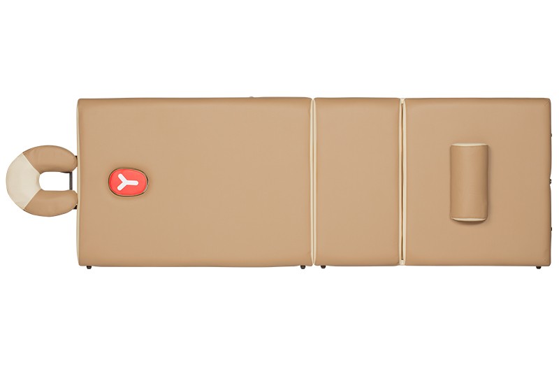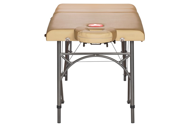 В столе имеется люверсное отверстие для лица, закрытое мягкой подушкой с логотипом производителя. Изделие комплектуется съемным подголовником с ручными опорами.