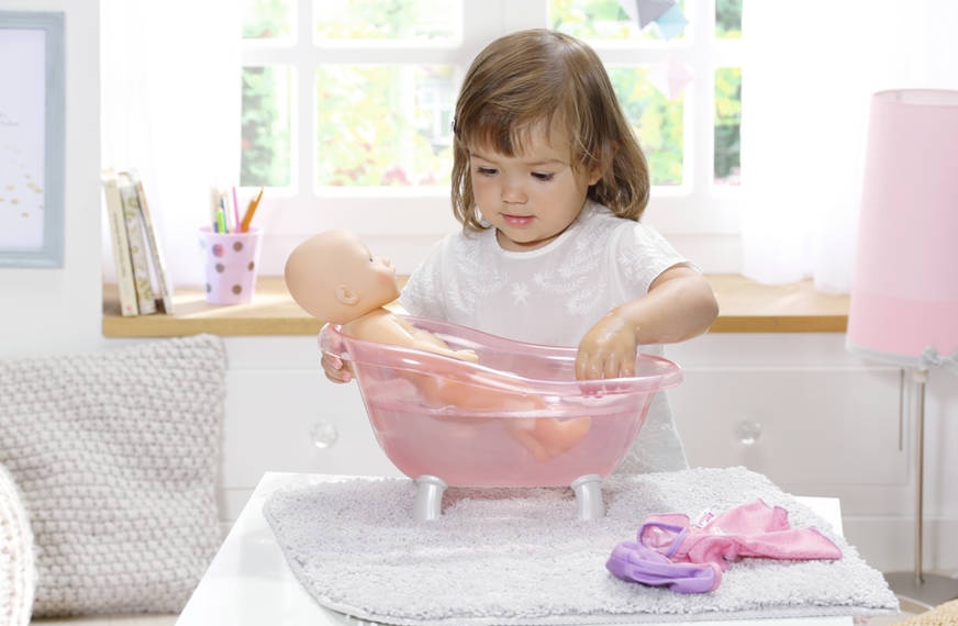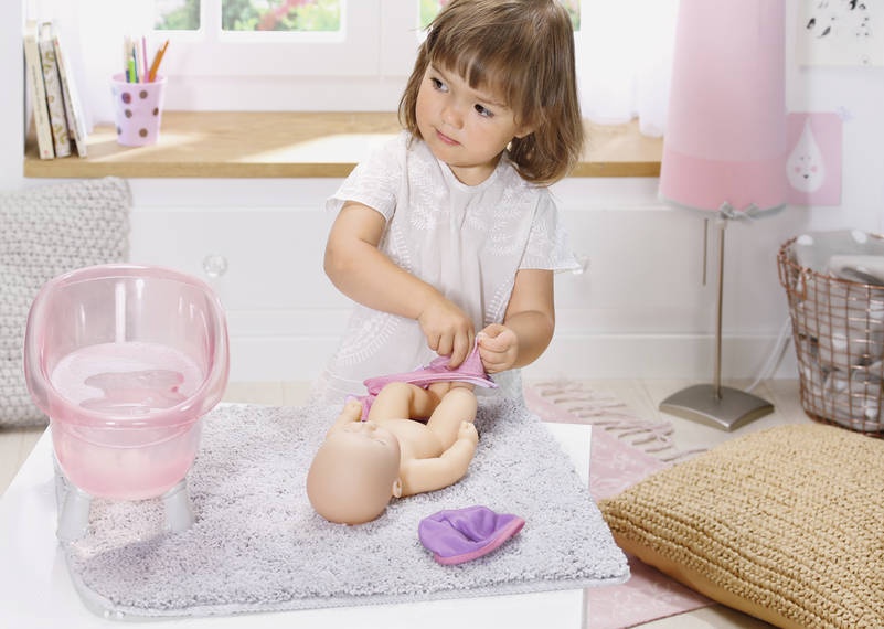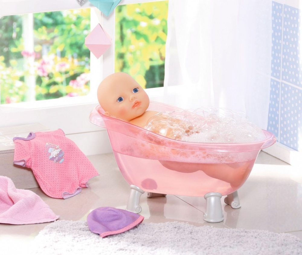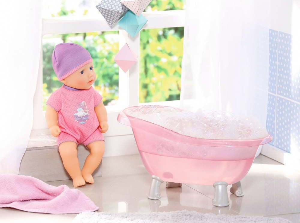 В комплект входит удобная розовая ванночка на ножках, в которой девочка сможет искупать свою куколку. Также игрушку можно брать с собой в ванную.