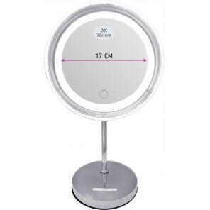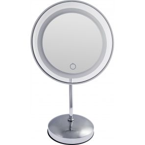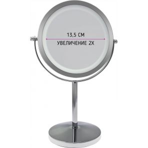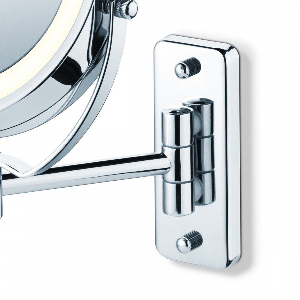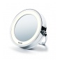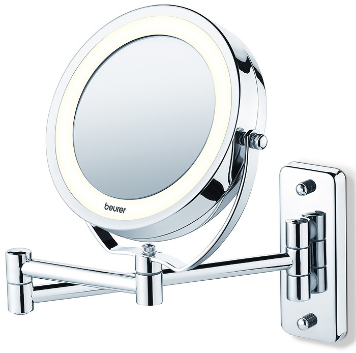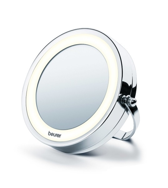 Beurer BS59 – компактное зеркало с возможностью настенного крепления на кронштейне. Модель имеет две отражающие поверхности, одна из которых обладает пятикратным увеличением. По периметру есть LED подсветка, которая включается с помощью кнопки на корпусе. Регулировать яркость нельзя. Работает все от четырех батареек типа ААА.