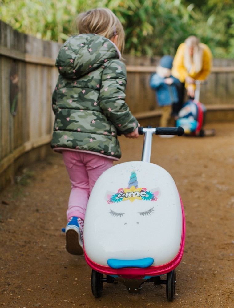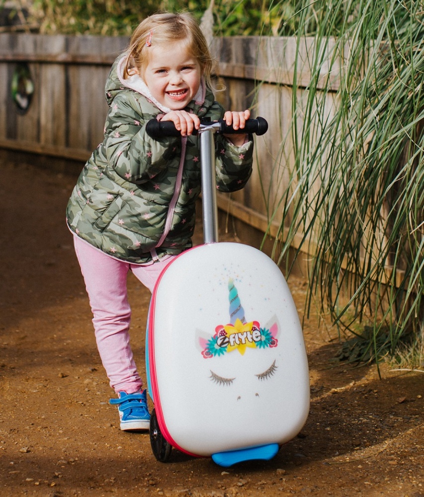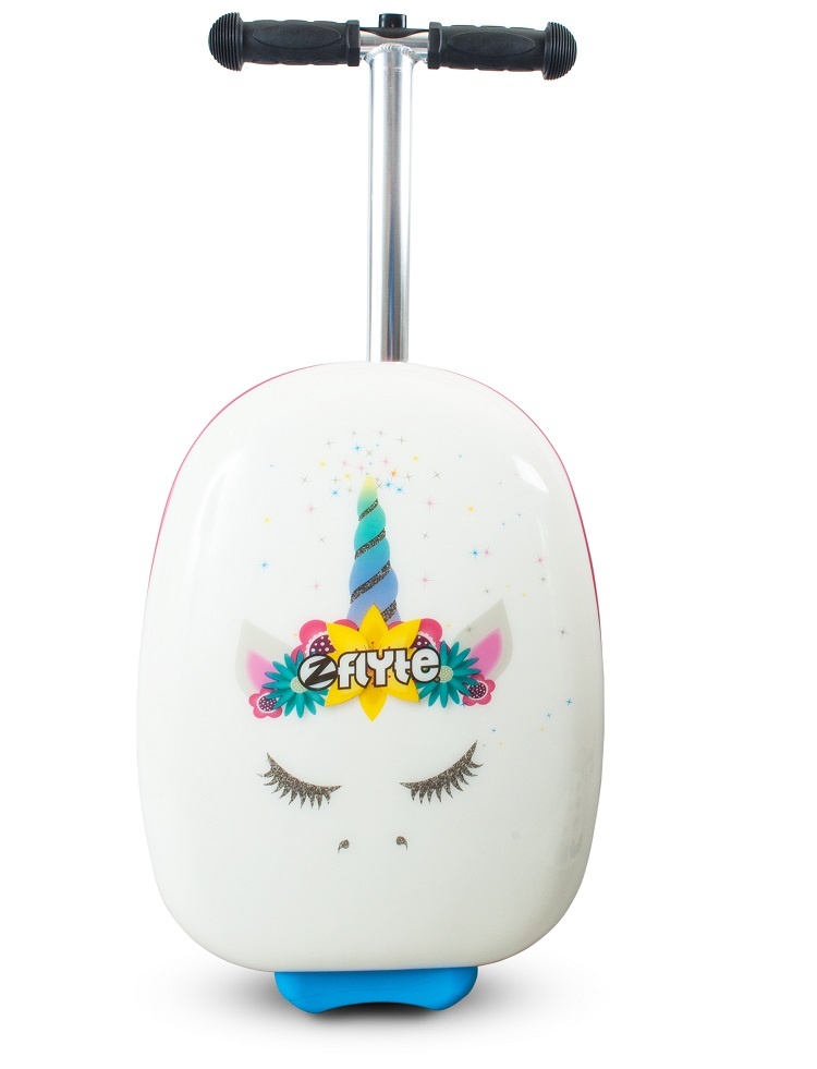 Самокат-чемодан «Единорог» - станет идеальным аксессуаром для маленькой путешественницы. Вещи можно сложить в чемодан, а перемещать багаж будет весело на красивом самокате в регулируемой рулевой стойкой и алюминиевой платформой.