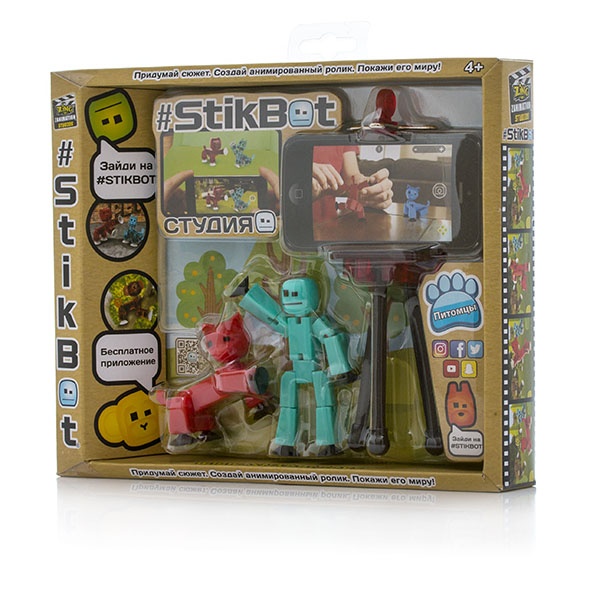Этот набор позволит детям пробовать себя в качестве режиссёра, создающего забавные сюжеты с участием яркого человечка стикбота и его питомица. Перед началом развлечения ребенку необходимо скачать на мобильное устройство бесплатное одноименное приложение на App Store и Google Play.