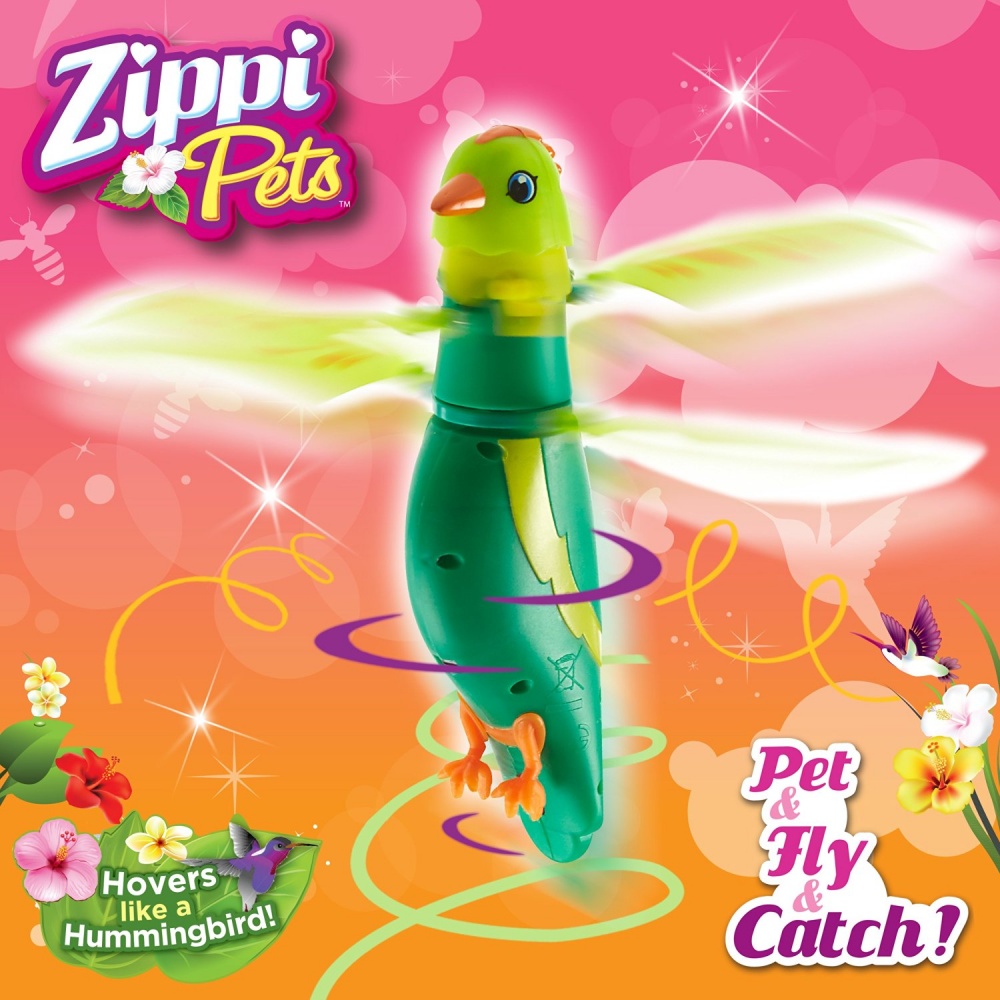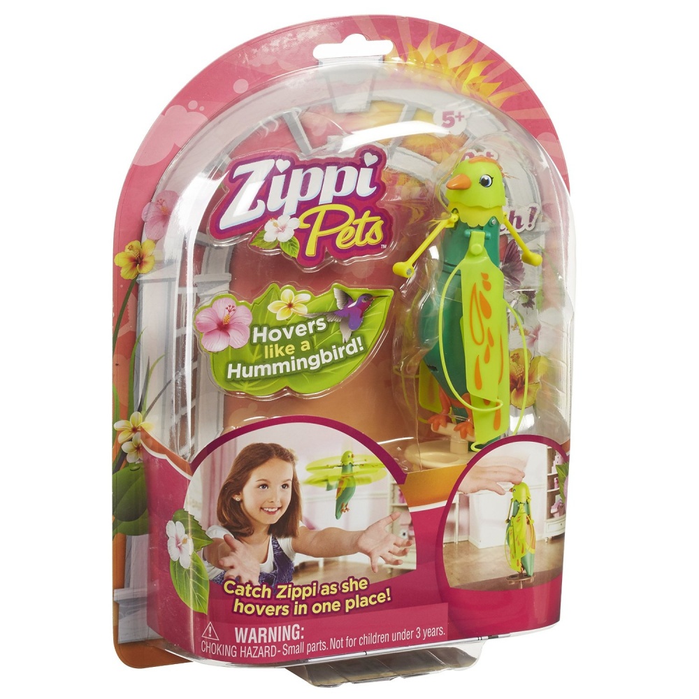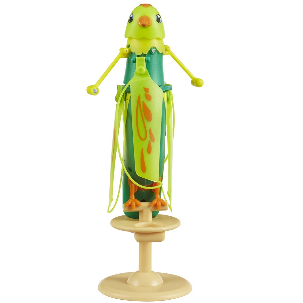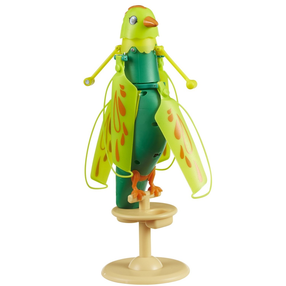 Интерактивная летающая птичка Zippi Pets зеленого цвета изготовлена из прочной и в тоже время легкой пластмассы. К ней прилагается пластиковая подставка, на которую игрушку можно установить. В игрушку встроены звуковые эффекты и, если погладить птичку по голове один раз, то она звонко запоет. Благодаря пропеллеру, расположенному у шеи, она также способна летать. Для этого нужно погладить ее три раза.